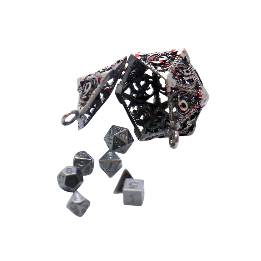 Tämä alkuperäinen avaimenperä on suunniteltu tyhjön metallisen monikulmaisen kuution muotoon, joka kätkee sisälleen 7 pientä monikulmaista noppaa, jotka on inspiroitu pöytäpelien ja fantasia RPG:n maailmasta. Yksityiskohtainen viimeistely tekee avaimenperästä vankka, mutta samalla elegantti ja koristeellinen. Liikkuvat nopat sisällä luovat hienovaraisen ääni-ilmiön, joka antaa avaimenperälle ainutlaatuisen luonteen. Avaimenperä on ihanteellinen ei vain avaimille, vaan myös tyylikkäänä lisävarusteena reppuun, laukkuun tai pelivarusteisiin.