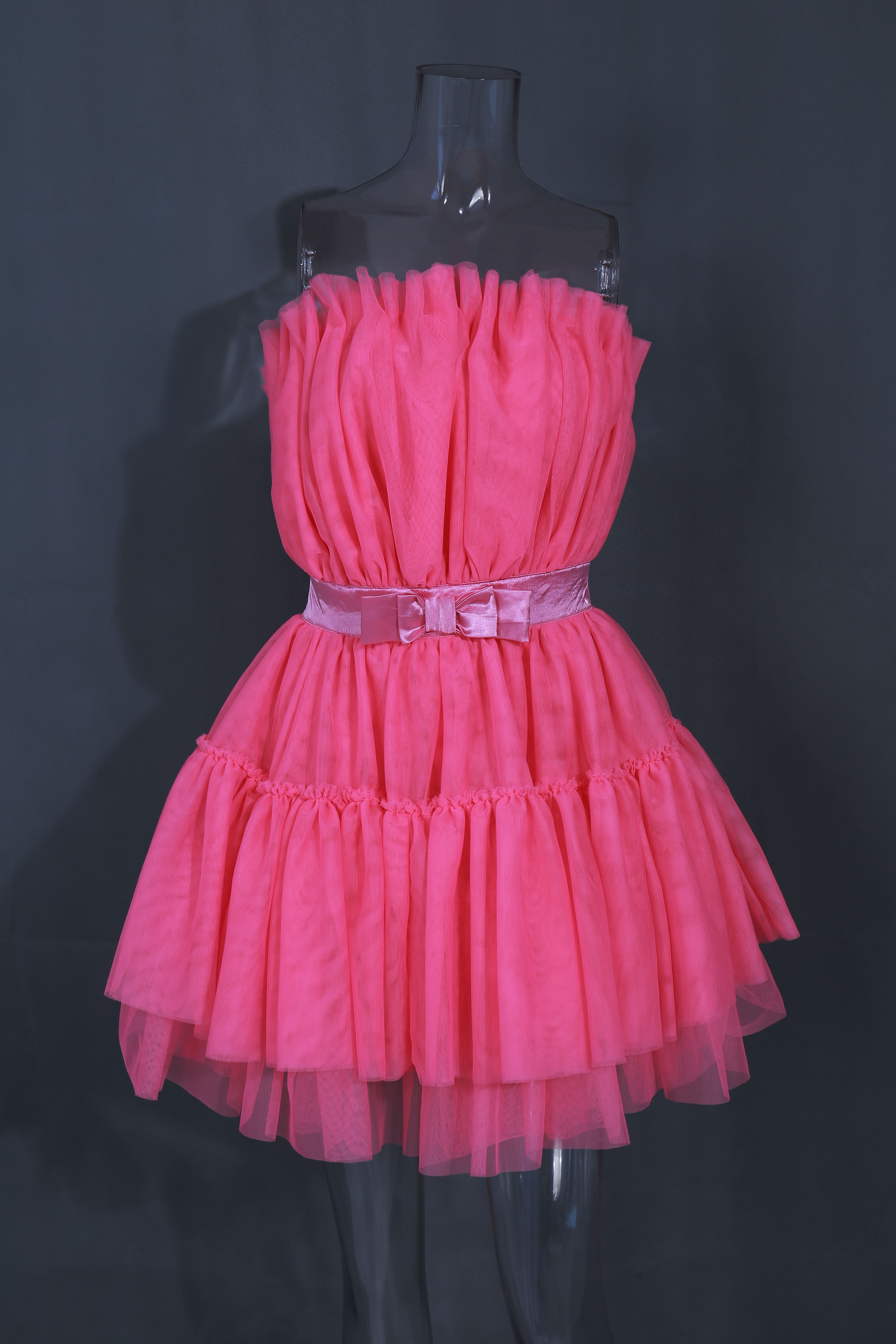 Naisten olkaimeton tyllimekko kerroshelmalla.
