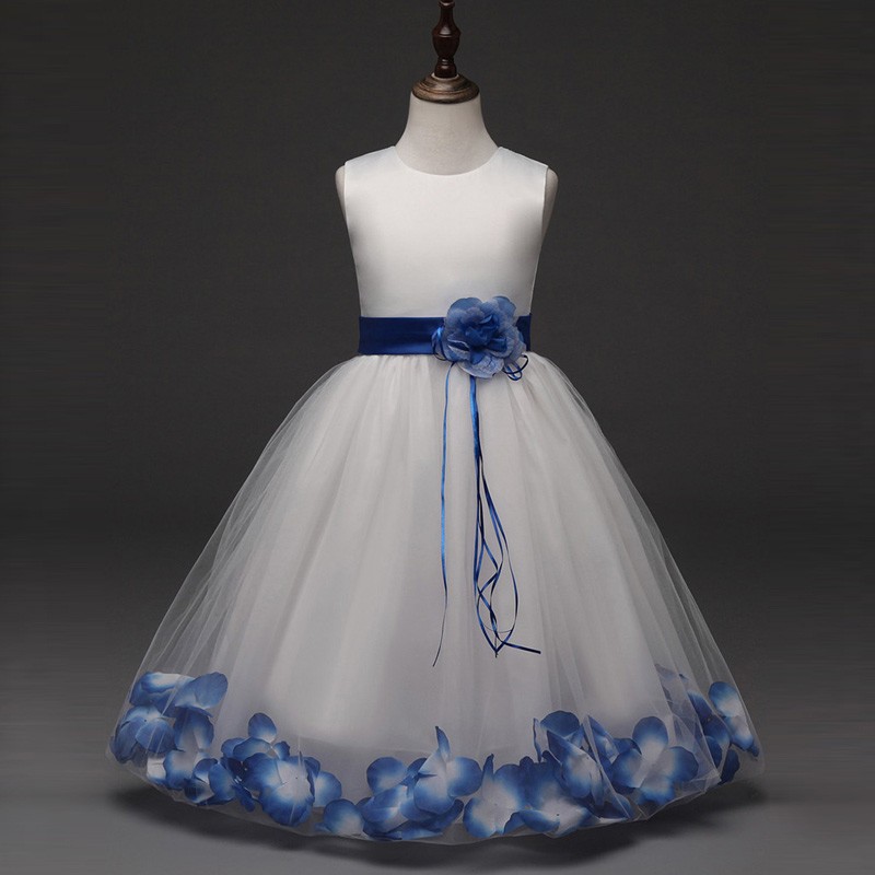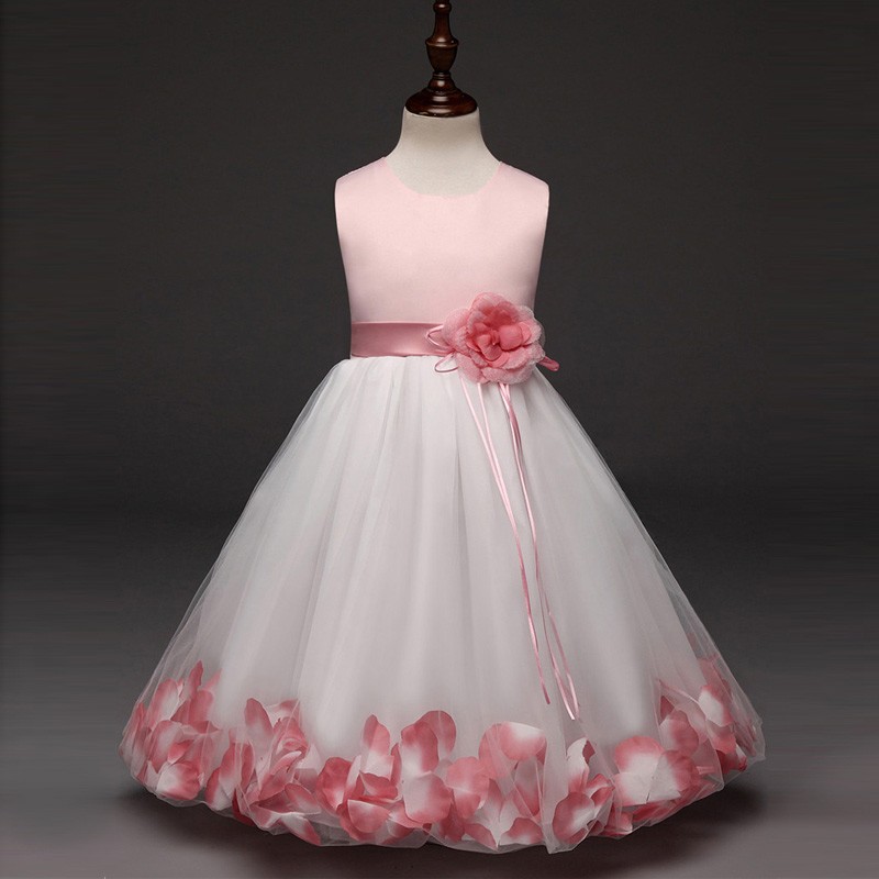 Kauniit tyttöjen mekot, joissa on rusetti vyötäröllä ja kukat aivan helmassa.