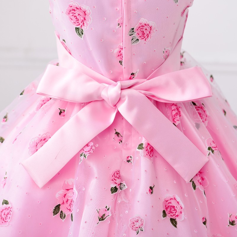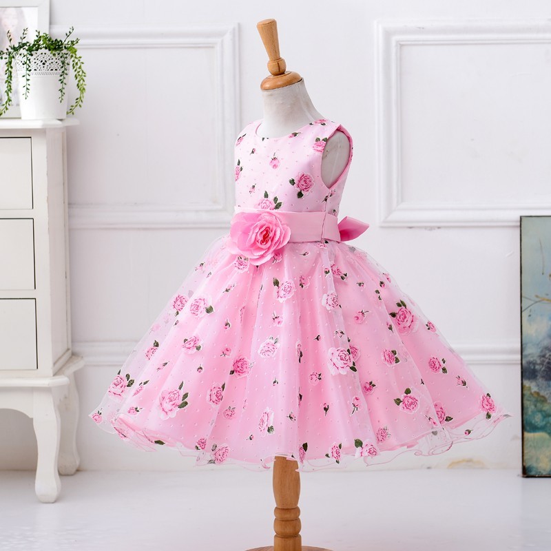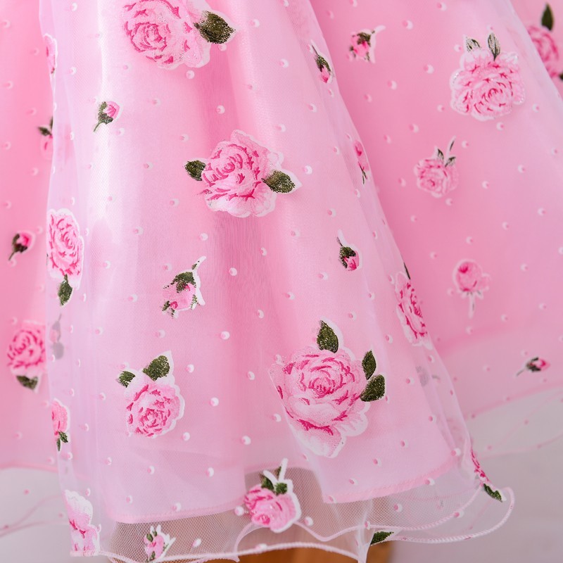 Kauniit tyttöjen mekot, joissa on kukkia ja iso ruusu vyötäröllä.