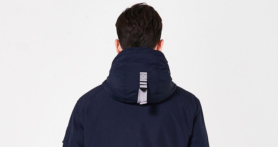 Tässä takissa on vetoketjukiinnitys ja huppu.