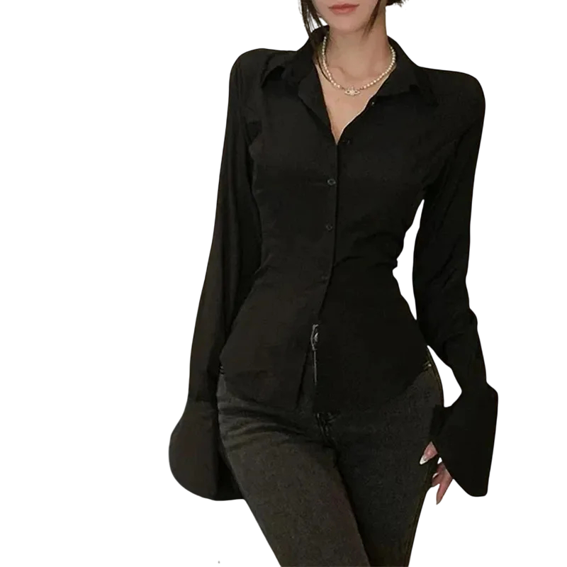 Etusivu Etusivu Vaatteet ja asusteet Naisten vaatteet Naisten kauluspaidat Naisten vapaa-ajan kauluspaidat Tyylikäs naisten kauluspaita Yksivärinen paita nauhoituksella selässä Leveät hihat Tyylikäs toppi kevyestä polyesteristä