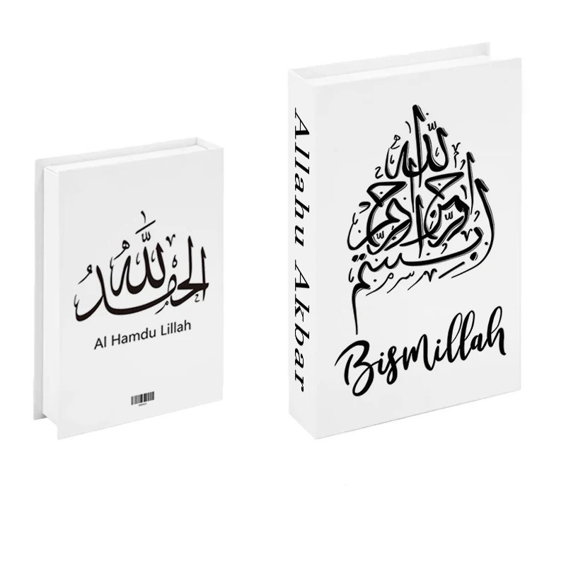 Tämä tyylikäs väärennetty kirja vie huomion voimakkaalla mustalla arabialaisella kalligrafialla puhtaalla valkoisella taustalla. Etupuolella on Bismillah-kirjoitus modernilla käsinkirjoitetulla tyylillä, jota täydentää yksityiskohtainen arabialainen kalligrafia tekstin yläpuolella. Takapuolella on Al Hamdu Lillah -teksti, joka yhdistää arabialaiset ja latinalaiset kirjaimet, luoden tasapainoisen ja elegantin muotoilun. Kirjan selkämyksessä on pystysuora teksti Allahu Akbar, mikä tekee mallista realistisen näköisen muiden kirjojen joukossa hyllyssä. Käytännön etuna on avattava malli piilotetulla säilytystilalla.