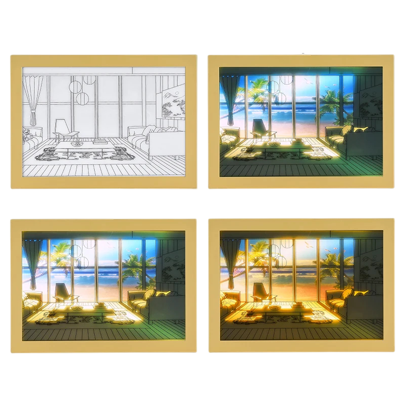 Valaisudekorointi ranta-talon teemalla maalauskankaan tyylillä. Moderni minimalistinen valaistus säädettävällä valon intensiivisyydellä, USB-virransyöttö. Täydellinen kuvaus