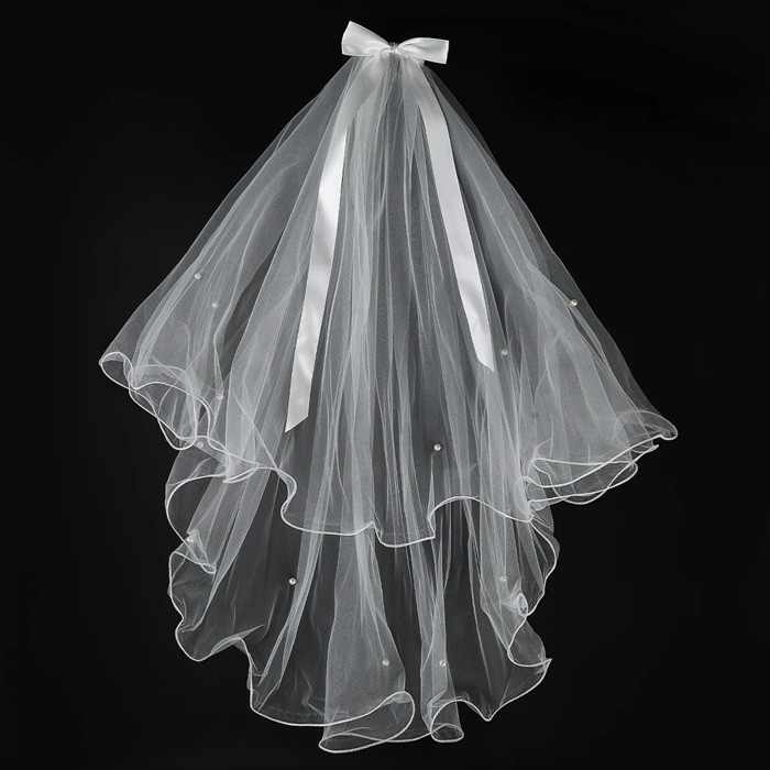 Romanttinen valkoinen tylli-verho on koristeltu näyttävällä nauhalla ja hienoilla helmillä, mikä tekee siitä juhlavan ja elegantin. Kerroksellinen leikkaus lisää volyymia ja laskeutuu kauniisti.