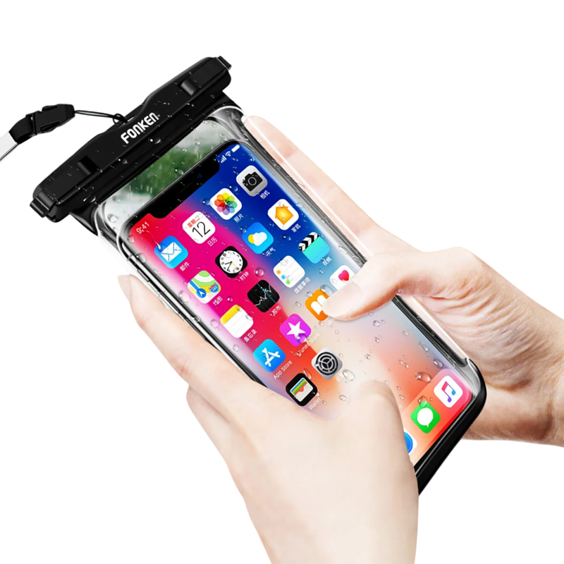 Käytännöllinen vedenkestävä suojus tarjoaa ihanteellisen suojan puhelimellesi vesilajeissa, matkustamisessa ja päivittäisessä käytössä. Läpinäkyvän rakenteen ansiosta puhelimen näyttö on aina täysin näkyvissä ja mahdollistaa kaikkien toimintojen mukavan käytön. Luotettava tiivistys suojaa puhelinta vedeltä, lumelta, pölyltä ja hiekalta, joten suojus soveltuu paitsi uimaan, myös vuorille, autiomaahan tai rannalle. Ultrakevyt rakenne irrotettavalla narulla takaa mukavan kantamisen kaulassa tai ranteessa, joten puhelin on aina käden ulottuvilla. Suojus on helppokäyttöinen, yleiskäyttöinen ja sopii useimmille matkapuhelimille.