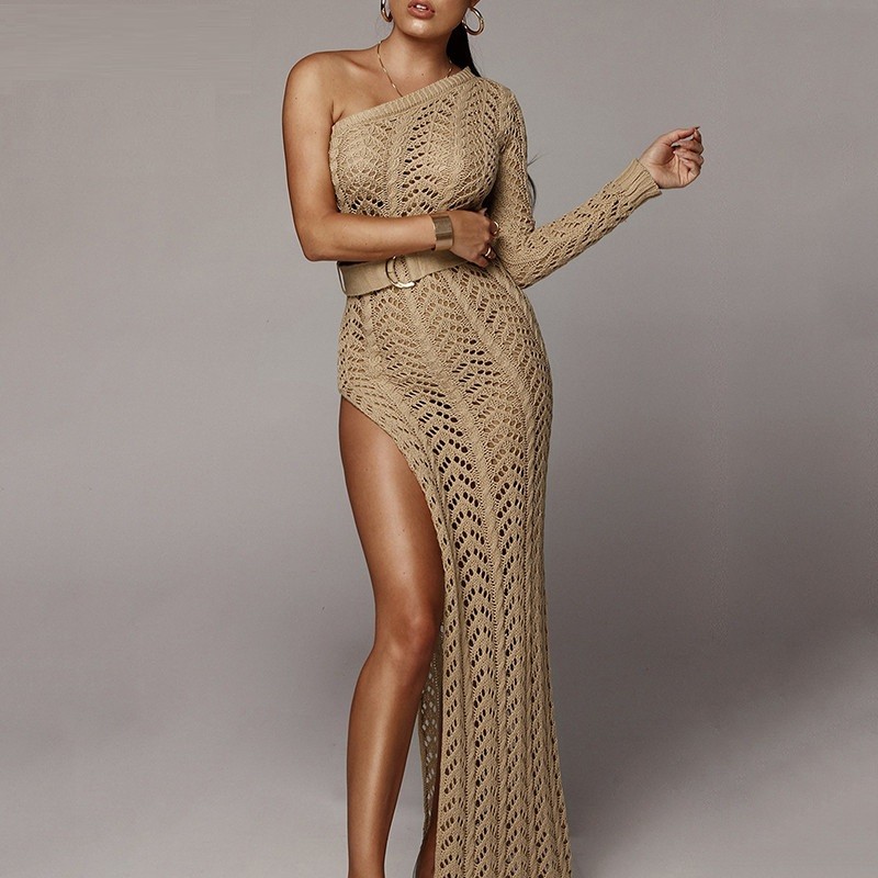 Kaunis pitkä virkattu yksiolkainen mekko.