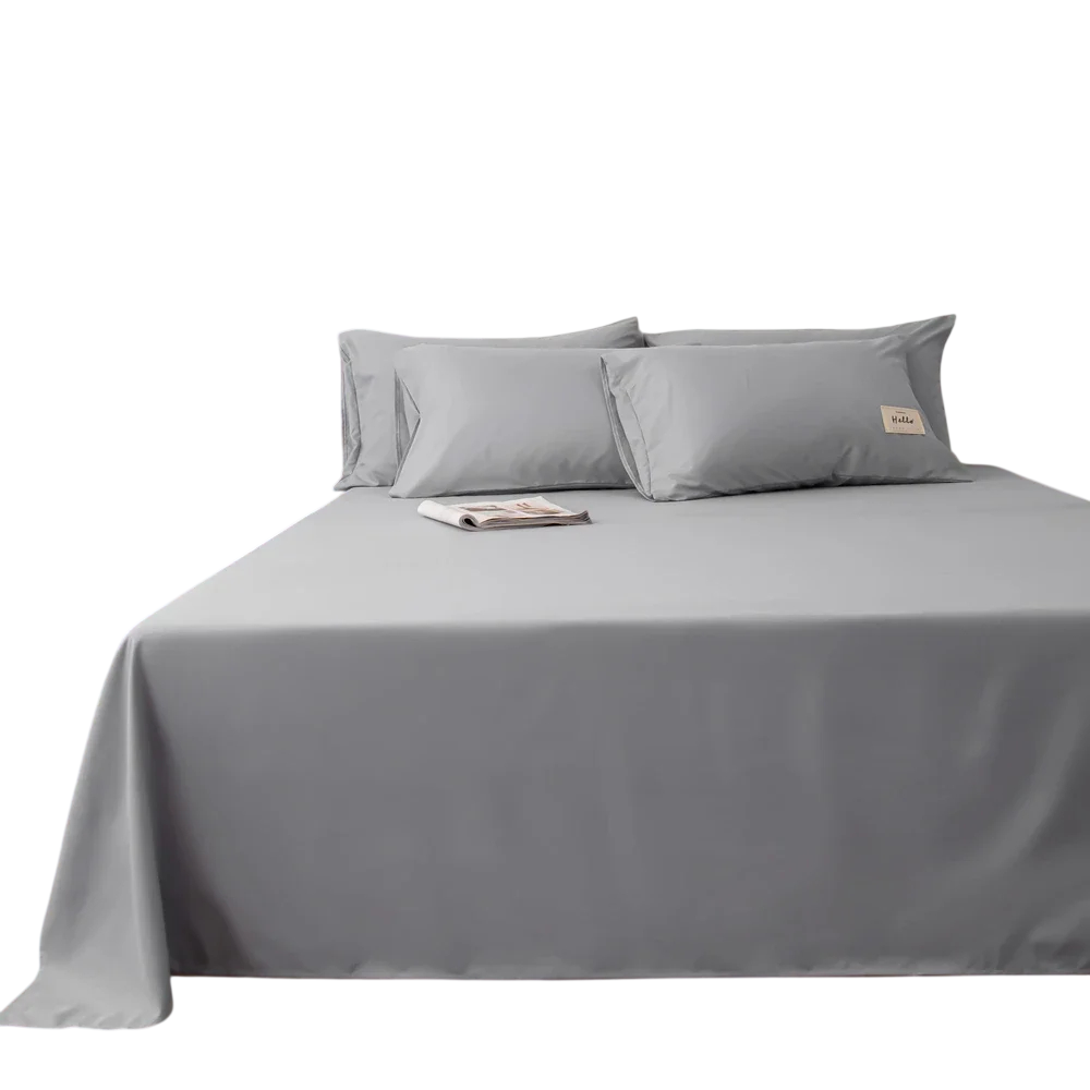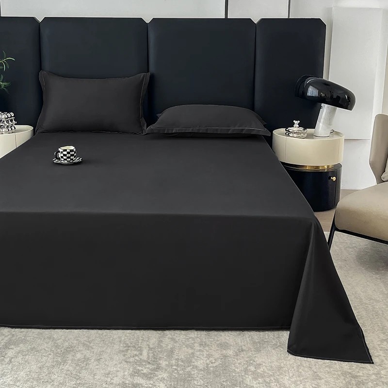 Yksinkertainen yksivärinen aluslakana, jossa on suora pinta, joka on tarkoitettu päivittäiseen nukkumiseen kotona ja opiskelija-asuntoloissa. Täydellinen kuvaus