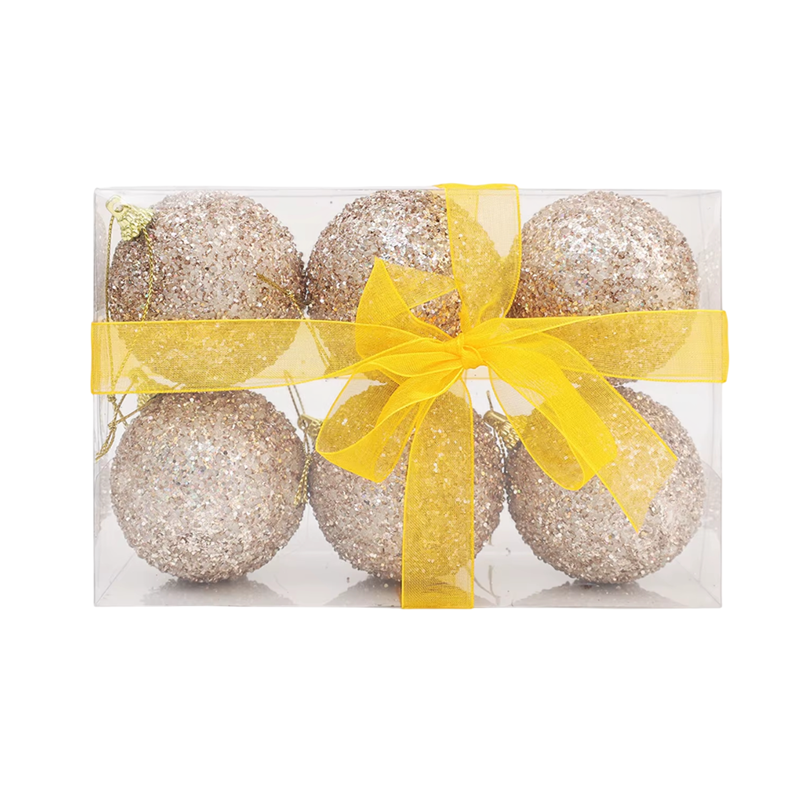 Klassinen pyöreä muoto joulupalloissa on ajaton ja helposti yhdistettävissä muihin koristeisiin. Samppanjan kultainen väri on hienostunut, elegantti ja harmoninen, mikä tekee siitä täydellisen valinnan sekä perinteiseen että moderniin joulukoristeluun. Kimaltava pinta tuo koristeisiin juhlavuutta ja täydentää kauniisti valosarjoja kuusessa.